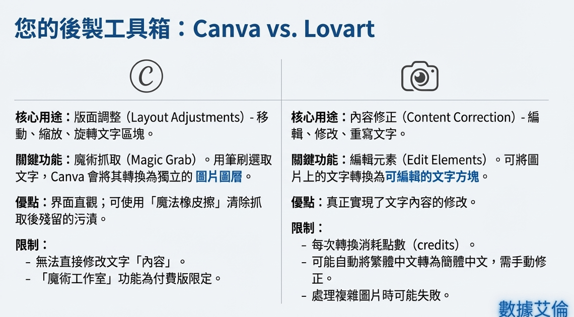 - 圖片文字 (Caption):在 Lovart 點擊「編輯元素」,或在 Canva 使用「魔法抓取」來分離文字與背景圖層。