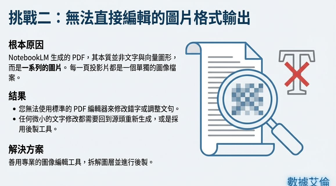 NotebookLM 輸出的簡報預設是 PDF 格式,若要進行後製修改,必須先進行轉檔。