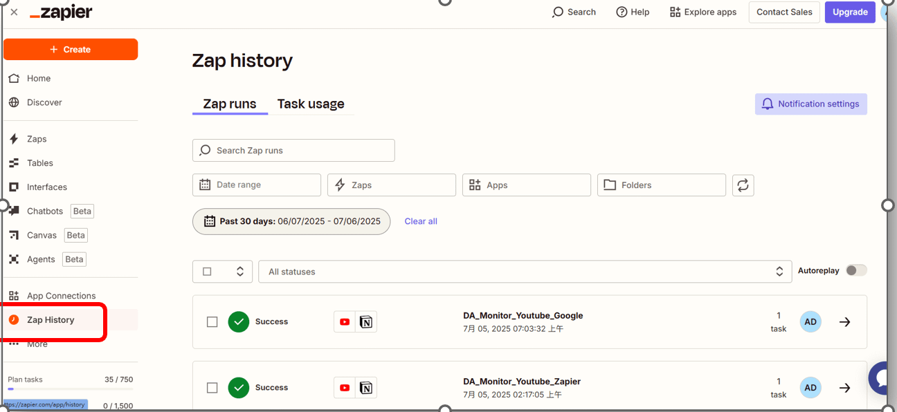 • Zapier 儀表板 (Dashboard) 的「任務歷史」(Zap History):這是最全面的錯誤記錄中心!你可以在這裡看到每個 Zap 的運行狀況,包括成功、等待、停止或出錯的任務。